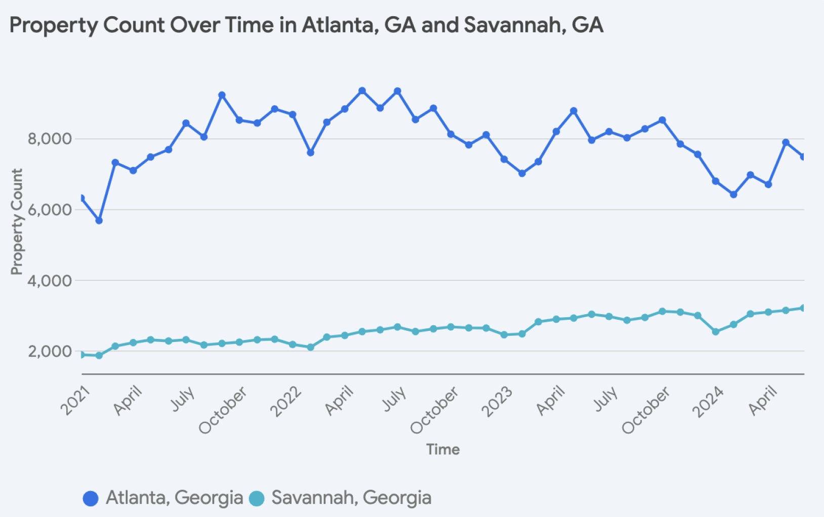 Between 2021 and 2024, both locations experienced significant revenue growth. This surge is likely attributed to the emerging regulatory barriers that are constraining the supply of STRs in both Atlanta and Savannah.