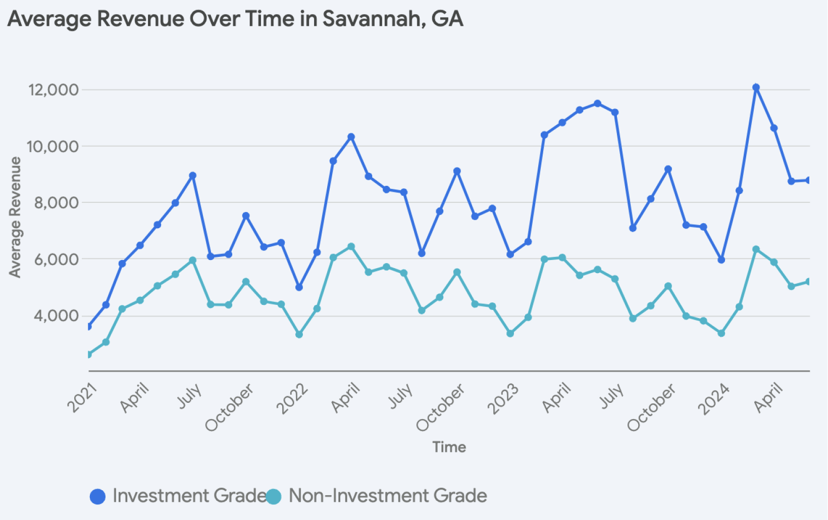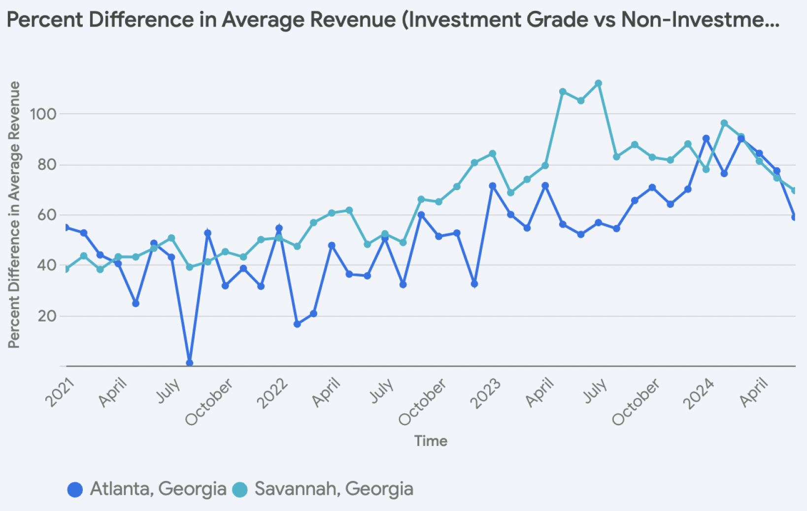 Additionally, as highlighted by the chart titled “Percent Difference in Average Revenue (Investment Grade vs Non-Investment Grade)”, the gap in performance between investment grade and non-investment grade properties as been steadily increasing over time. This means that for both Atlanta and Savannah, the revenue performance of investment grade properties has been growing faster than non-investment grade properties.