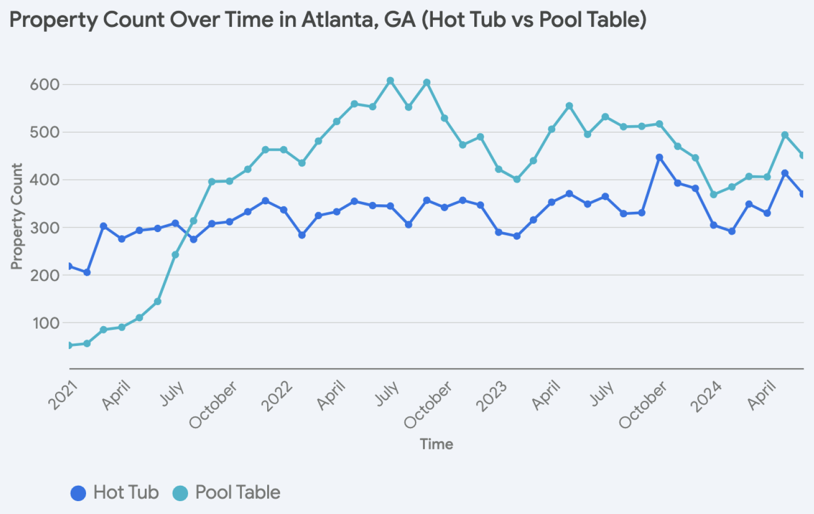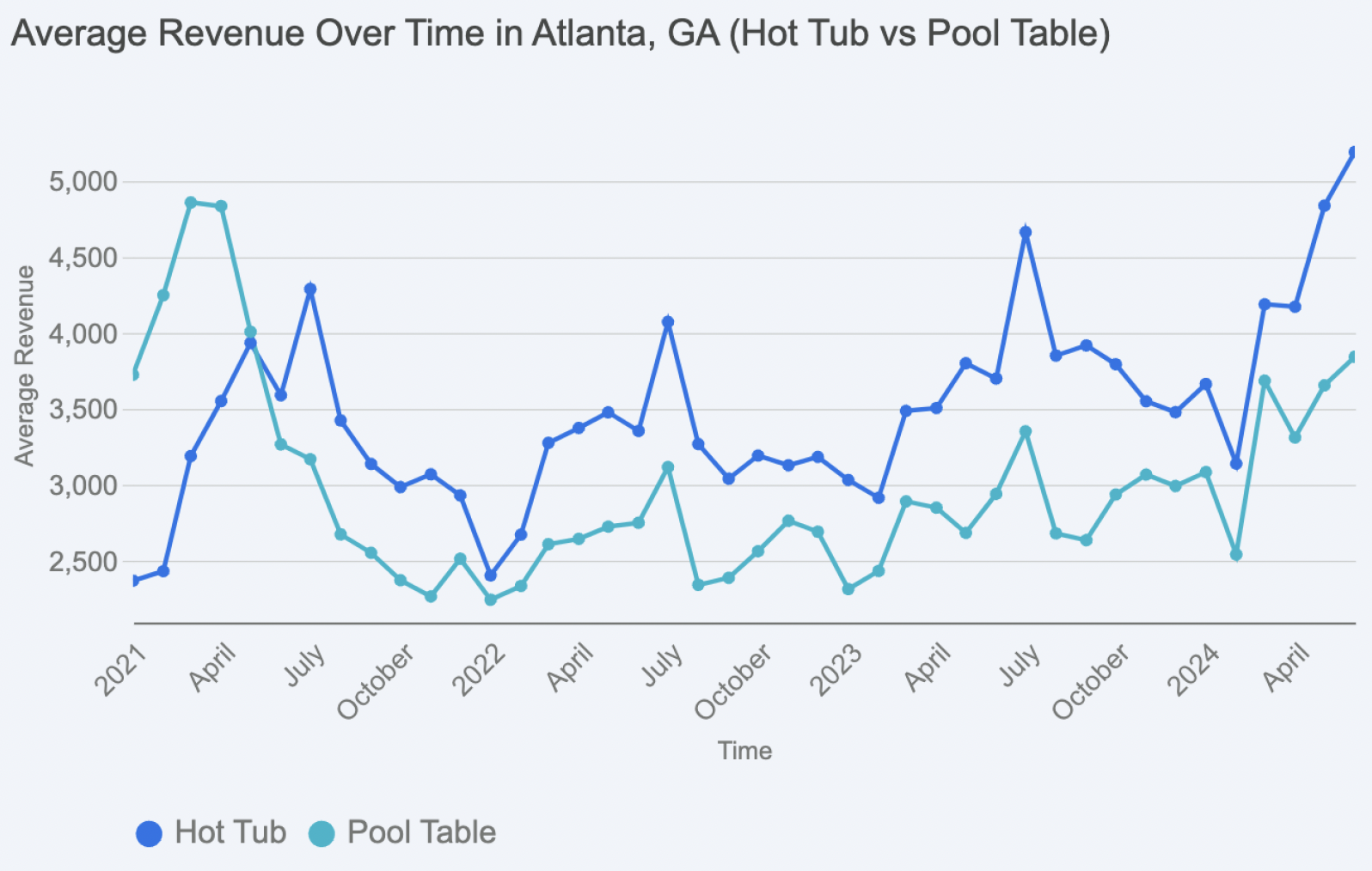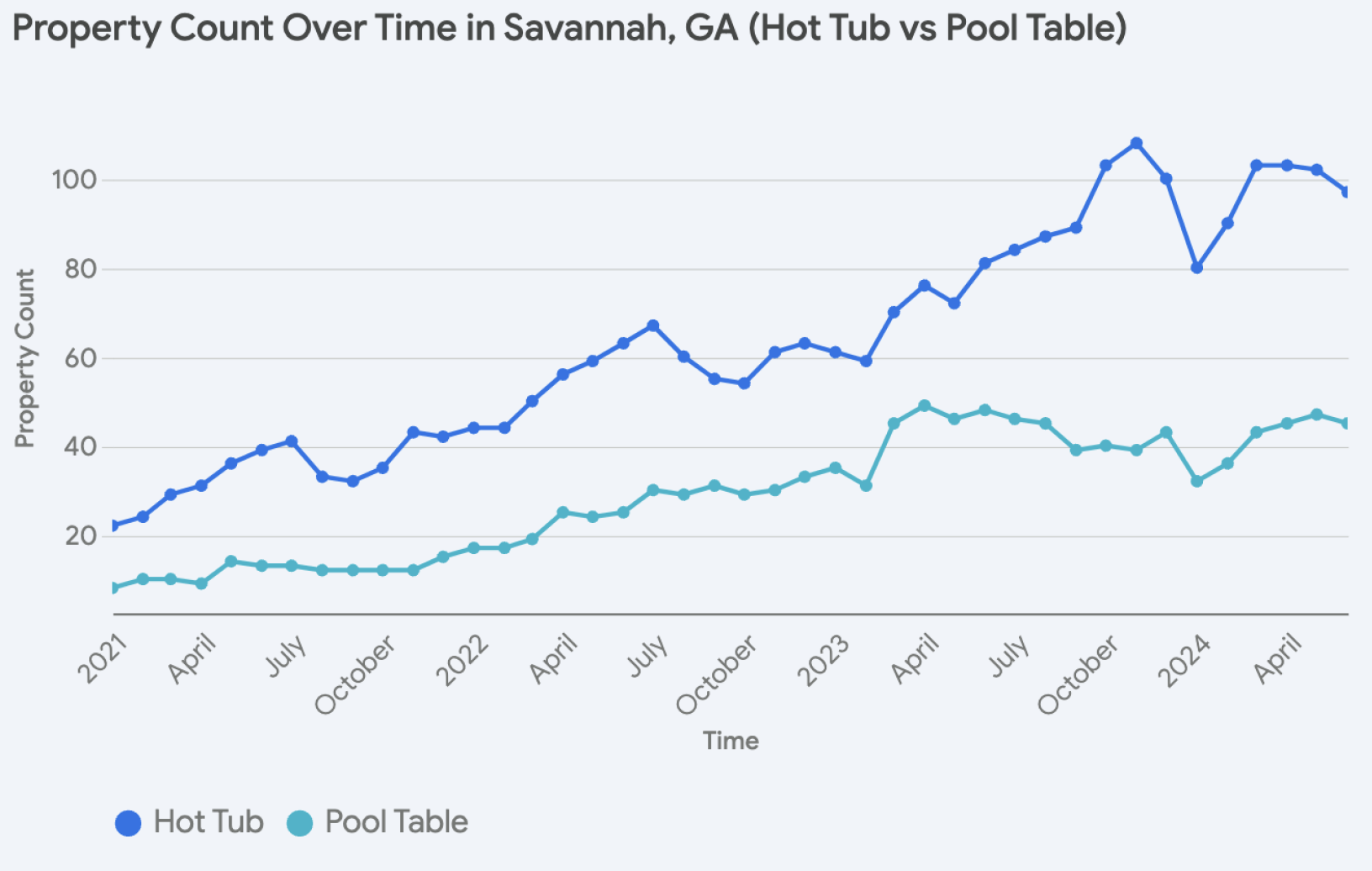 However, the performance of these amenities has been changing since 2021. Between 2021 and 2024, properties in Savannah with hot tubs saw a substantial increase in average revenue of 138.38%, while properties with pool tables experienced a decrease of 21.78%. Properties in Atlanta with hot tubs experienced a 54.61% increase in average revenue per property, while those with pool tables saw a decrease of 17.19%.