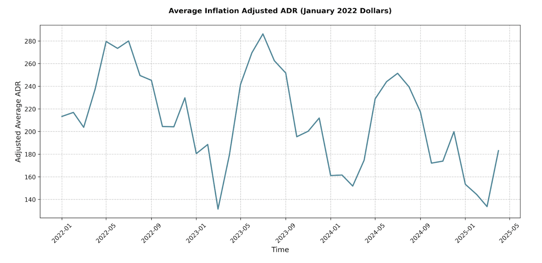 • Average Daily Rate (ADR): The inflation-adjusted ADR in January dropped from $213 in 2022 to $153 in 2025.