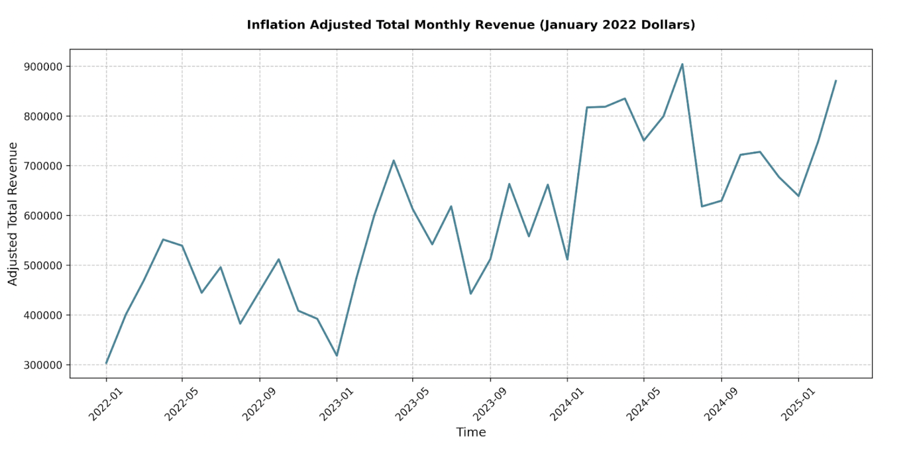 Total monthly revenue (adjusted for inflation) has climbed impressively:
