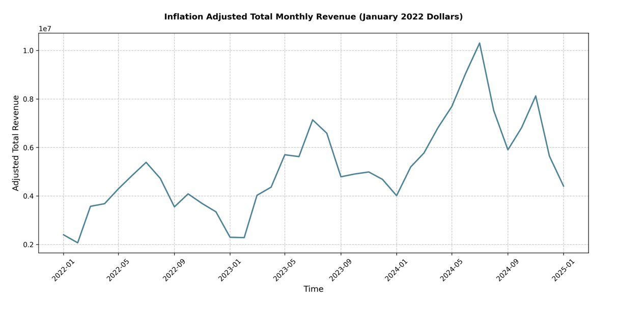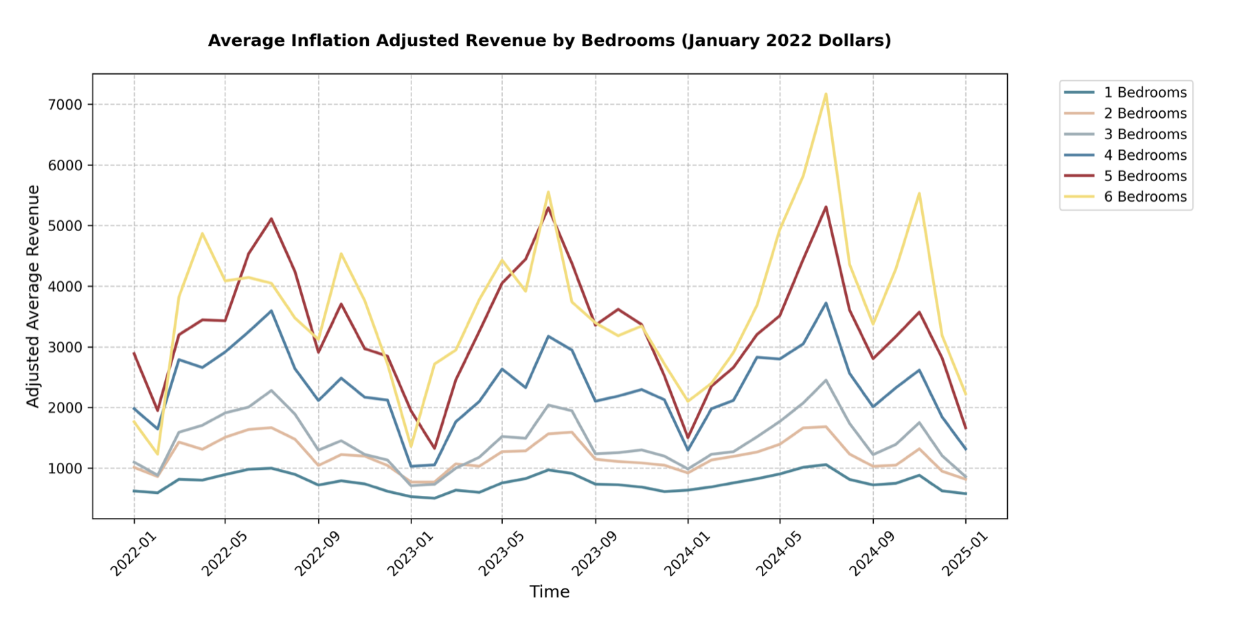 Reviewing the inflation-adjusted revenue data month by month from January 2022 to January 2025 across all bedroom counts confirms a few key points: