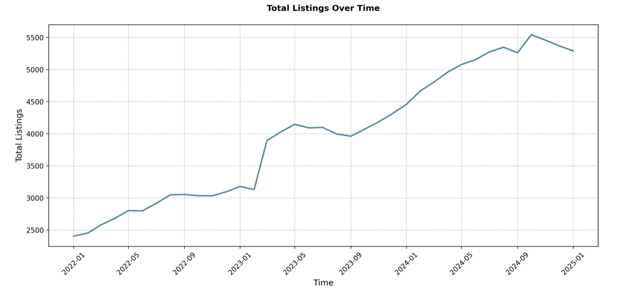 Concurrently, the number of STR listings has also seen a substantial increase, growing from 2,404 in January 2022 to 5,290 by January 2025.